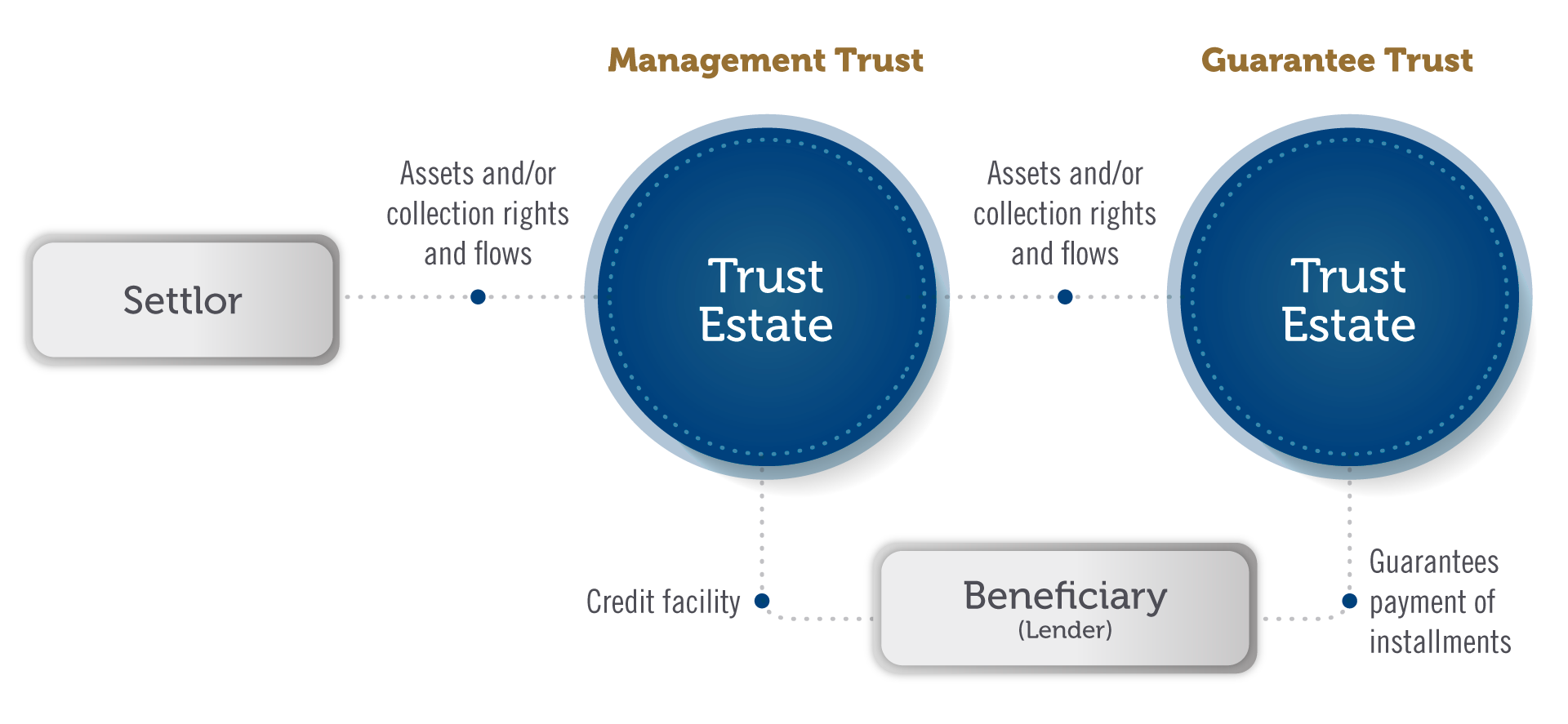 - Management Trust: The trustor assigns to this trust assets and/or collection rights and flows. Then, the trust subscribes a credit facility to a lender (trustee), which will be guaranteed by the Guarantee Trust.