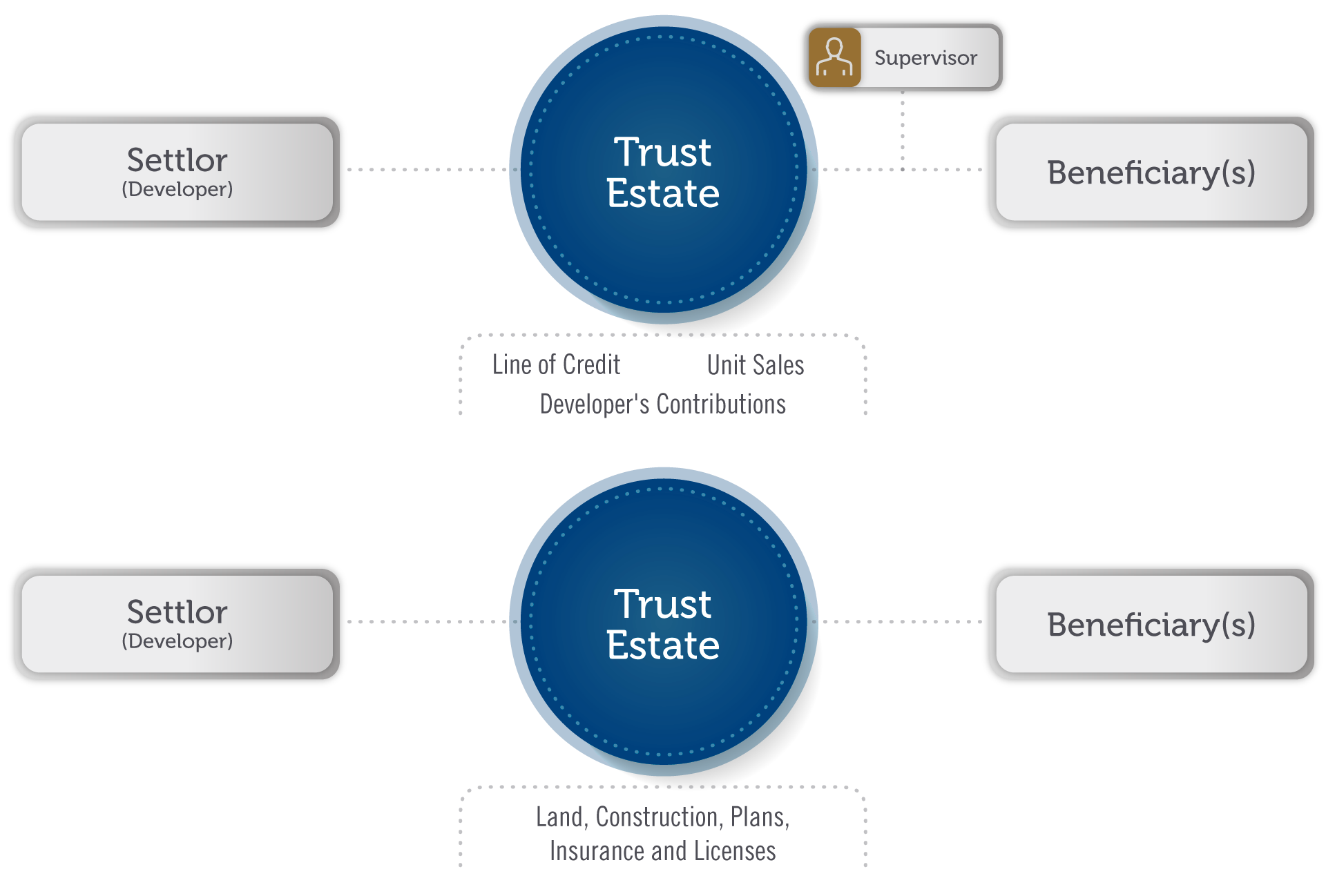 The patrimony is composed of all the assets that are part of a real estate project, having the possibility of structuring two trusts instead of one. In this alternative, there is an Asset Trust composed of the land, plans, insurance, among others; and a Flows Trust composed of the settlor's collection rights (monetary contributions from the developer/builder, payments from the purchasers, among others).