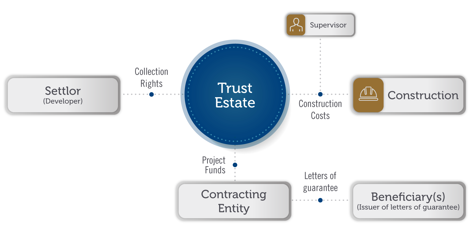 The purpose of this structure is to ensure that the development of a real estate project is carried out with transparency, ease and order, and to make all project payments (construction costs, financing payments, etc.). However, the responsible before the purchasers will continue to be the developer/builder (trustor) of the project.
